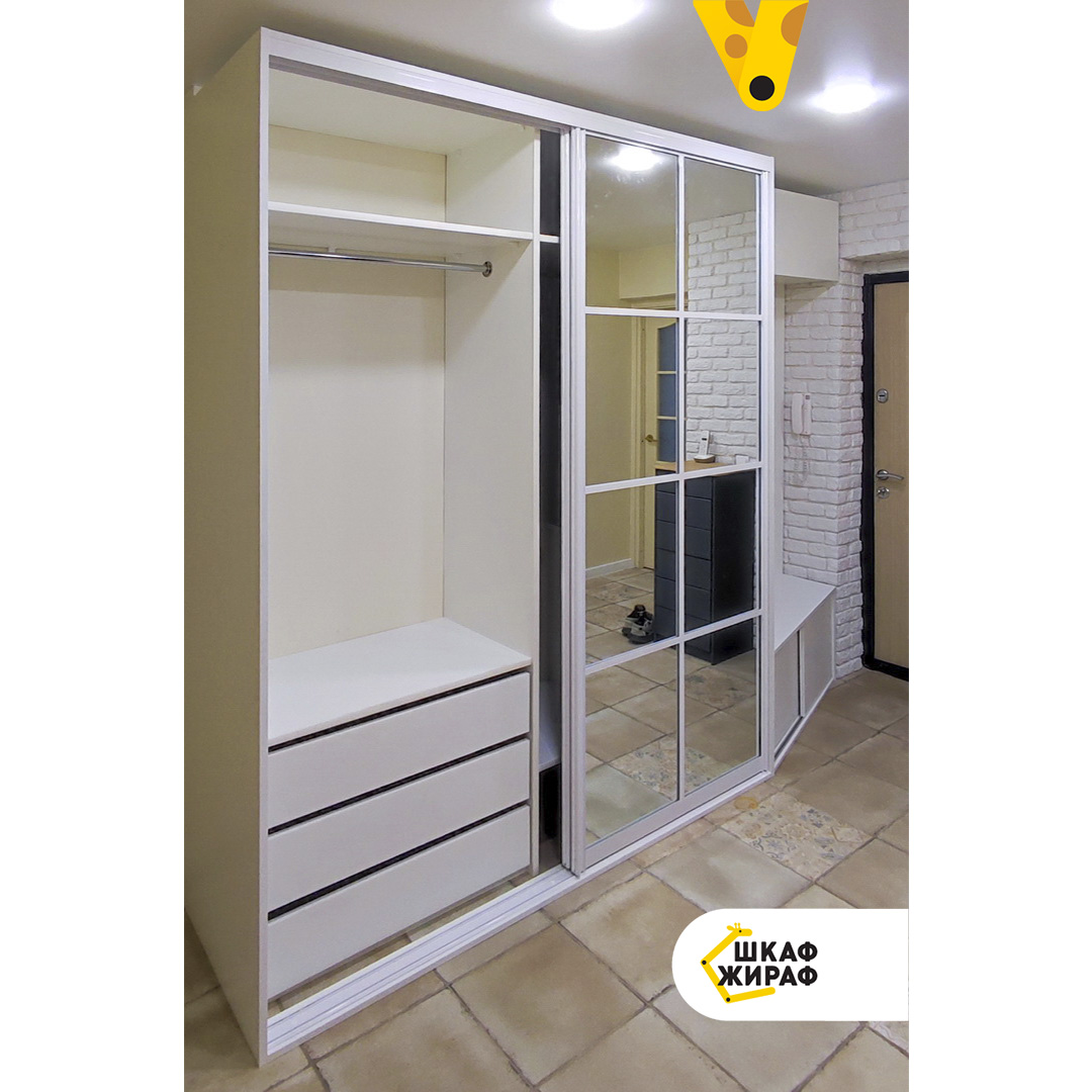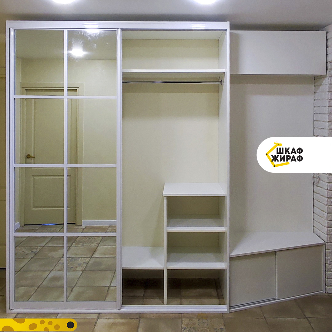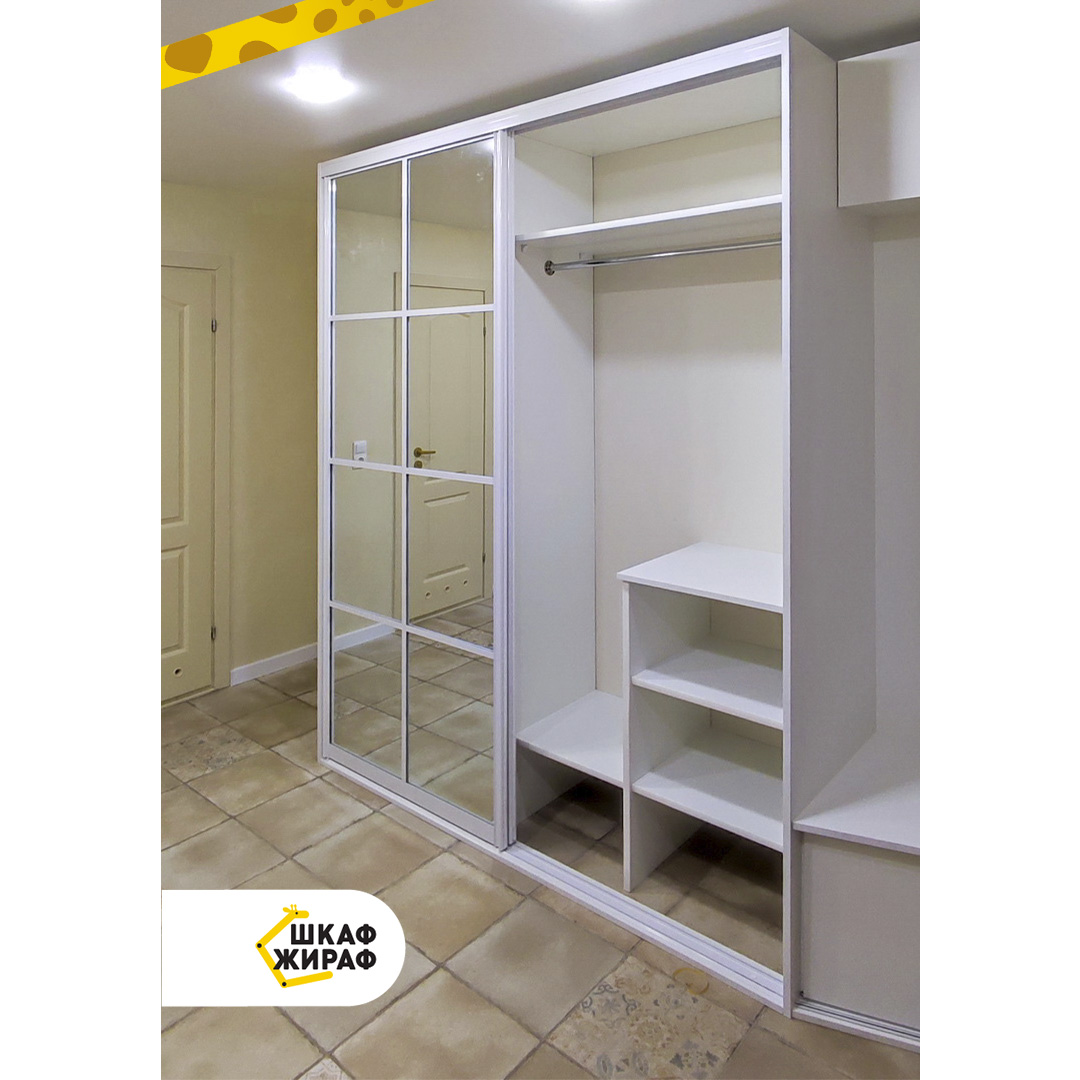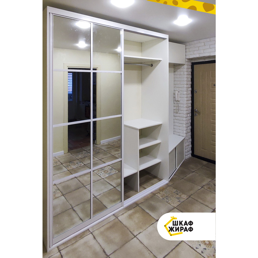 Двухдверный зеркальный шкаф-купе с открытой частью, которая состоит из тумбы для обуви с раздвижными дверьми из ДСП, антресольной полки с откидным фасадом и зашивки под крючки для верхней одежды (фото были сделаны до того, как повесили крючки).