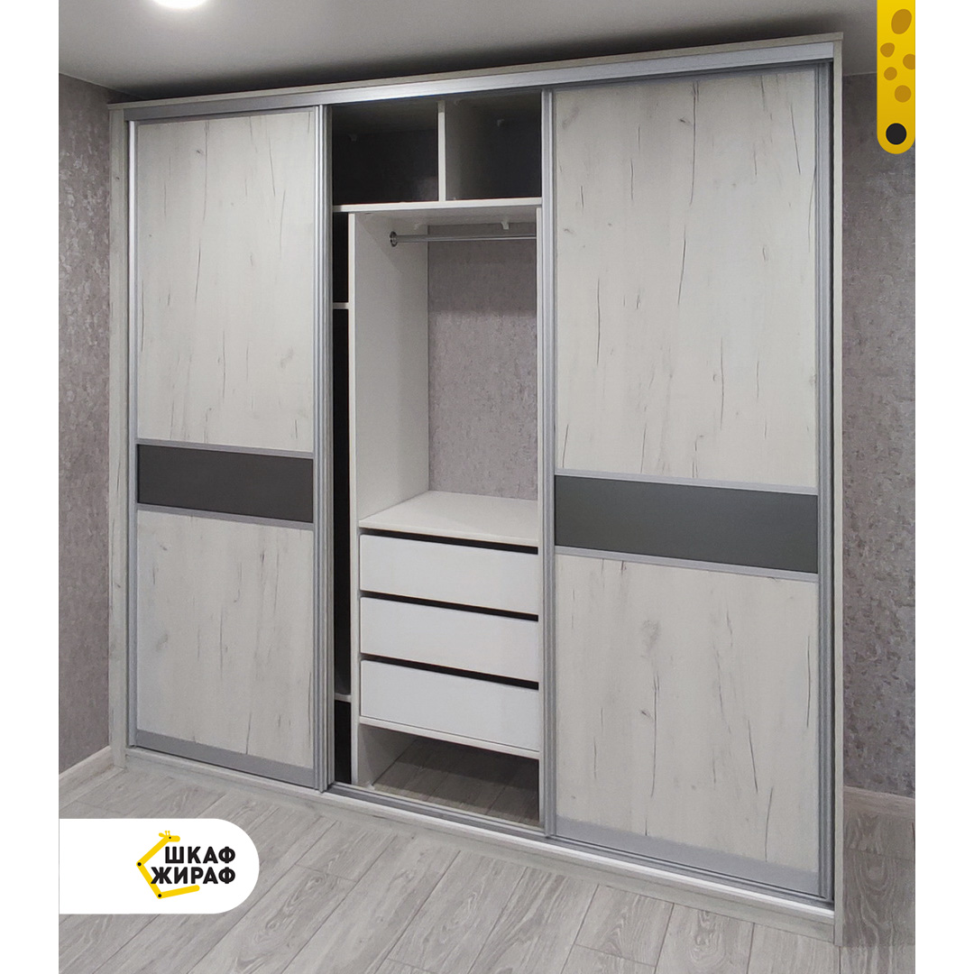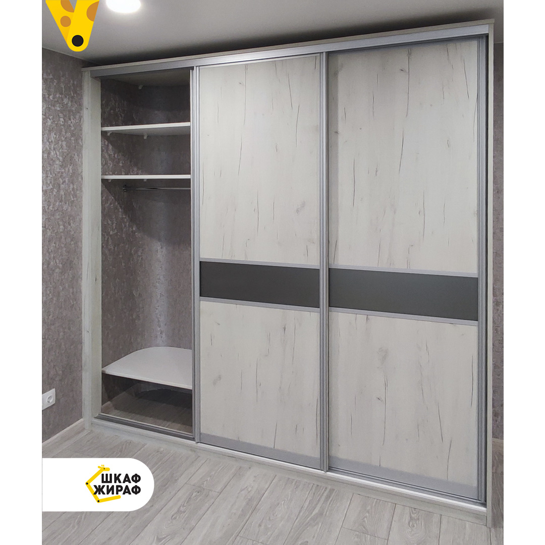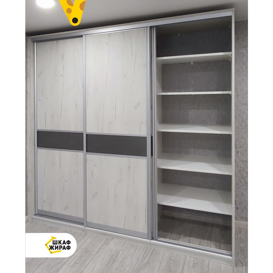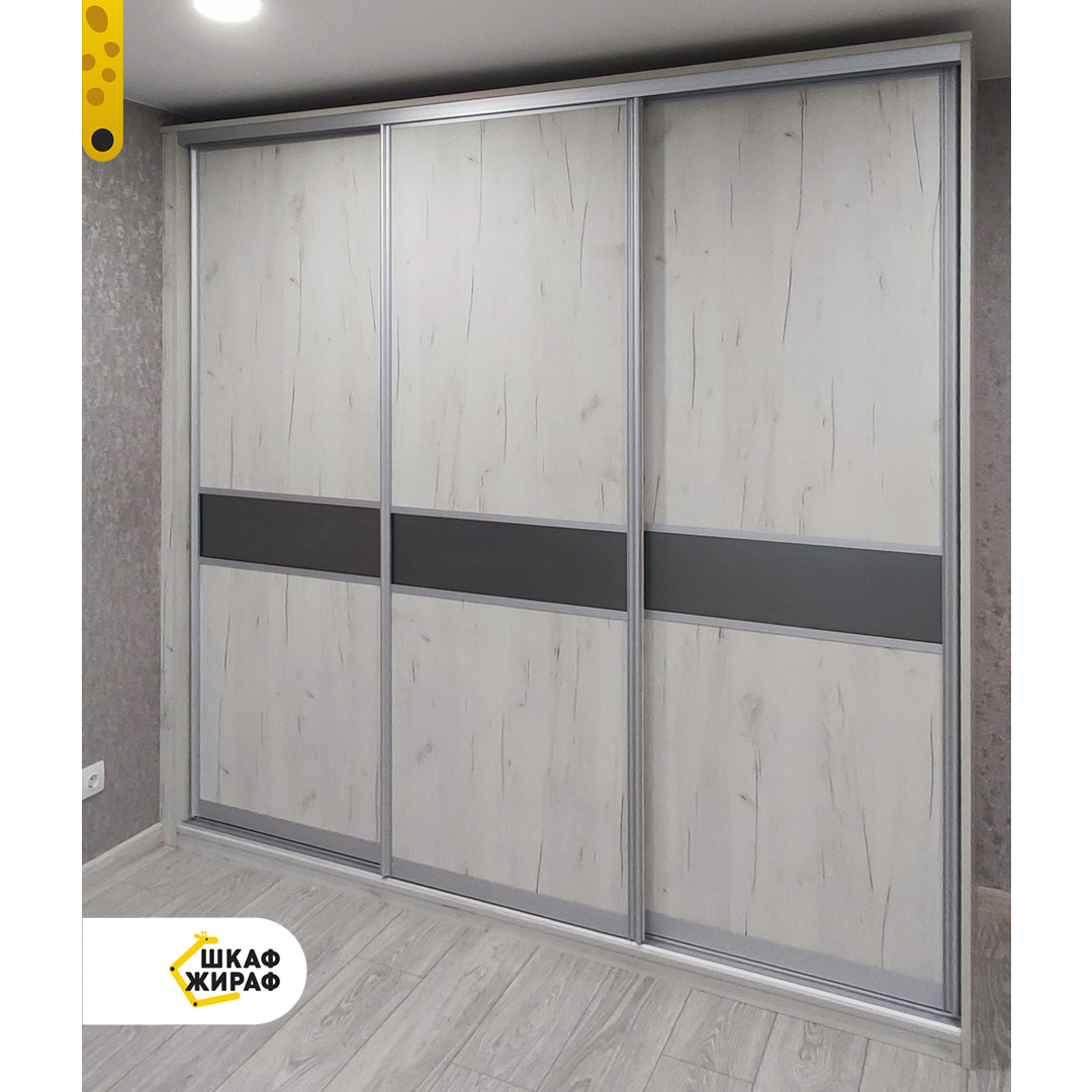 Трехдверный полувстроенный шкаф-купе с боковой стенкой, крышей, дверьми из светлой ДСП со вставками сатинированного зеркала графитового цвета в серебряном профиле Modus.