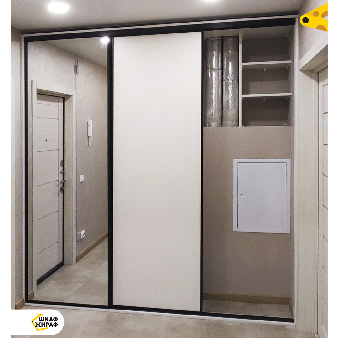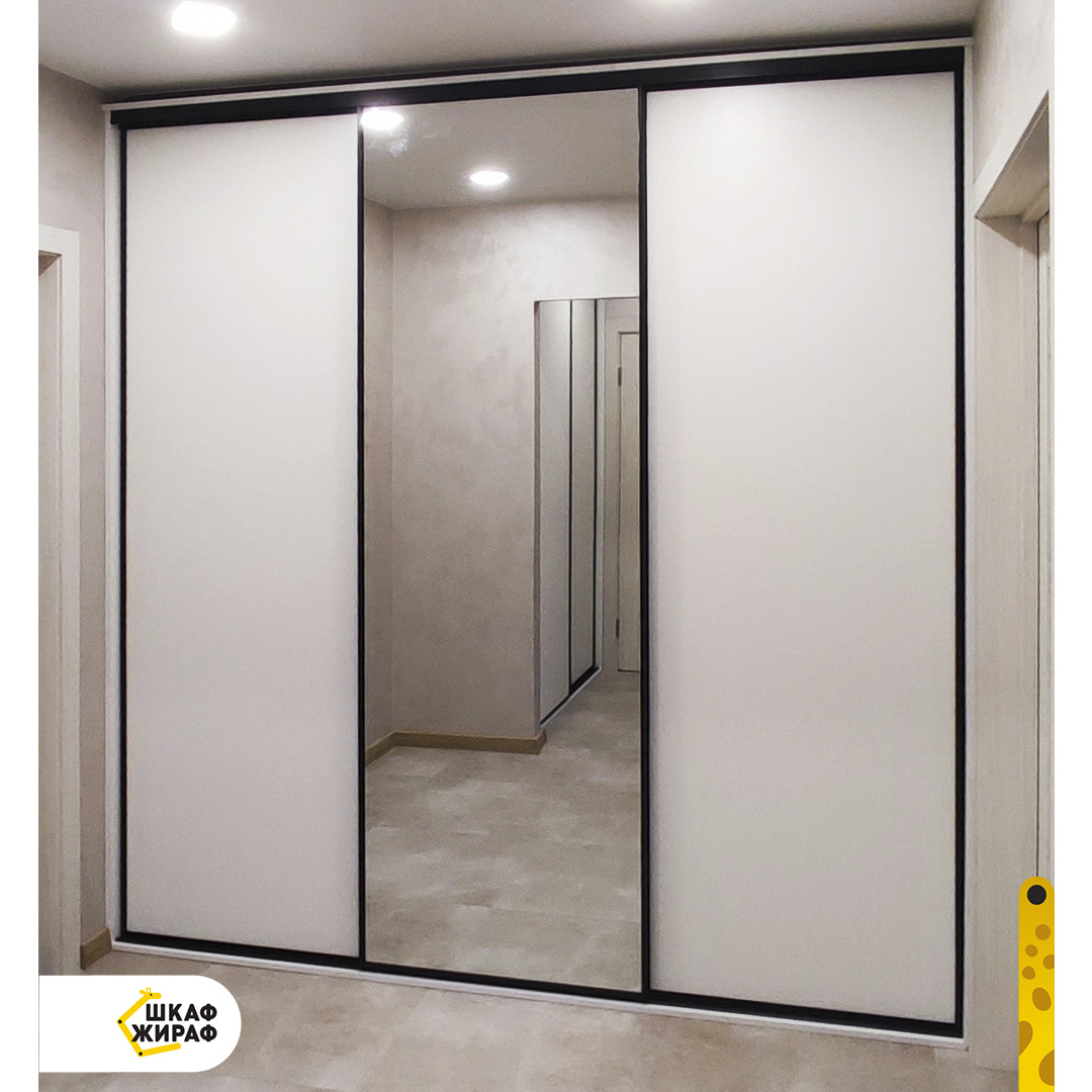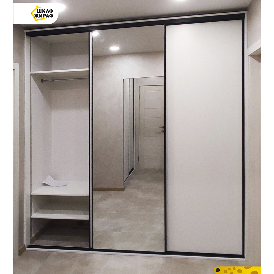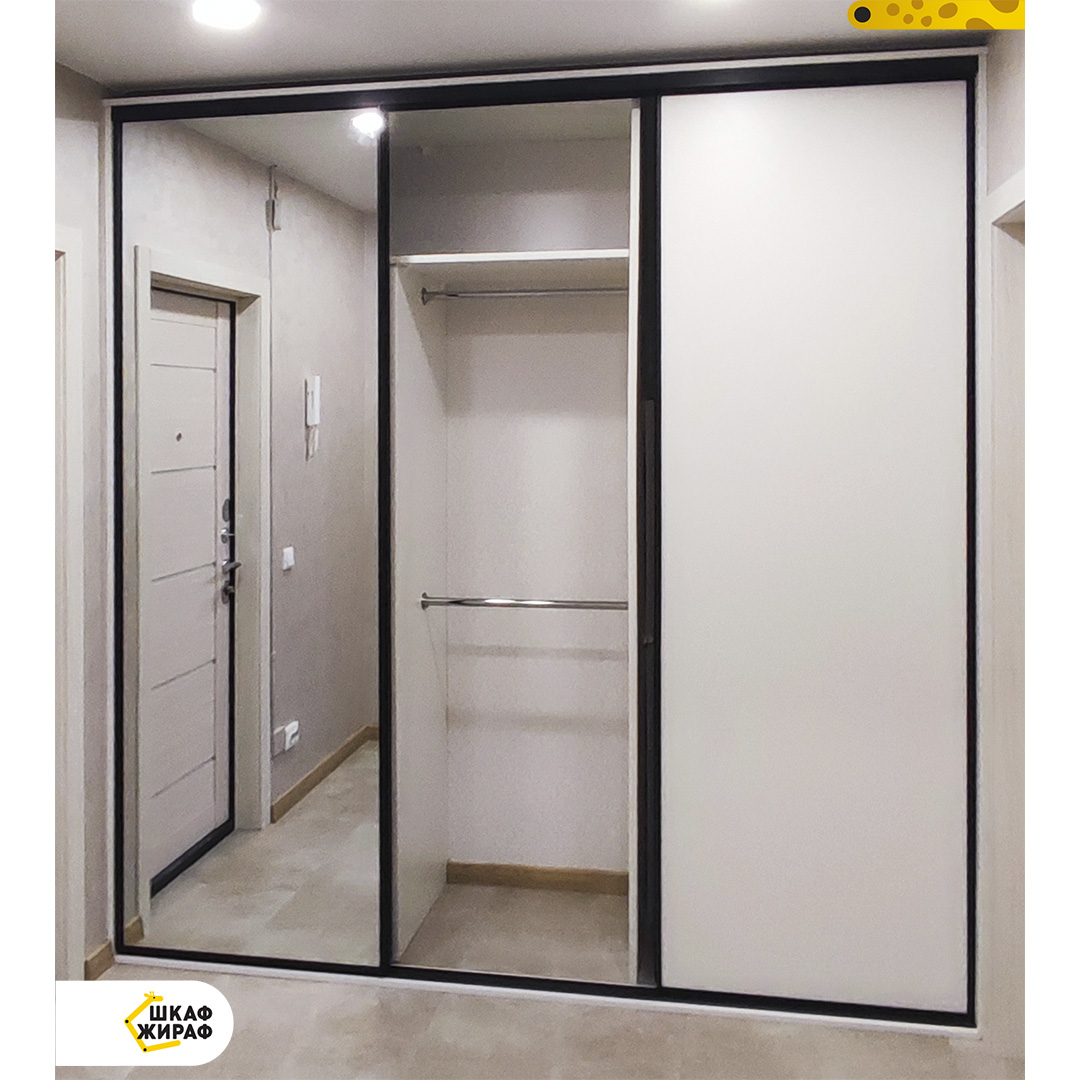 Трехдверный шкаф-купе в прихожей. Фасады из зеркала и белой ДСП в черном узком профиле Modus.