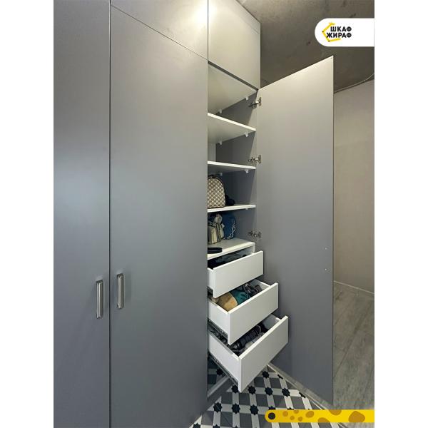 По индивидуальному с полками, штангами и выдвижными ящиками на шариковых направляющих полного выдвижения.
